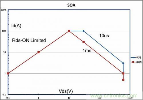 SOA曲線所圈出的另外一個重要區(qū)域受到Rds-On的限制。在這個區(qū)域內(nèi),器件上的電壓就是流經(jīng)器件的電流乘以導(dǎo)通電阻。在圖1所示的SOA曲線示例中,Rds-On為100毫歐。硅MOSFET的溫度取決于它們的Rds-On,這一點(diǎn)眾所周知。在器件溫度從25ºC升高至大約100ºC時(shí),它們的Rds-On幾乎會加倍。