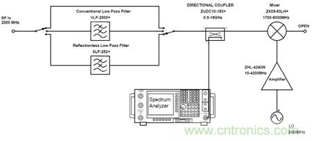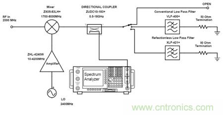 以下將組成測(cè)試電路對(duì)比傳統(tǒng)濾波器和無反射式濾波器分別配對(duì)相同混頻器的性能。