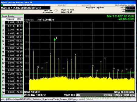依照?qǐng)D7所示測(cè)試電路,將測(cè)試3種不同狀態(tài)下從混頻器反射到源端的信號(hào)頻譜: