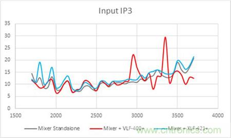 同樣的,在IP3的測(cè)試曲線也顯示了混頻器輸出端配對(duì)傳統(tǒng)濾波器后導(dǎo)致的不穩(wěn)定曲線。而使用無反射式濾波器配對(duì)混頻器的輸出端則使得IP3性能與混頻器本身的IP3性能保持一致。