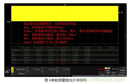 僅僅通過波形的直觀表現(xiàn)來分析異常信號遠(yuǎn)遠(yuǎn)不夠,只有將波形各項指標(biāo)精確量化,才能看透波形異常的本質(zhì)。ZDS2000系列示波器標(biāo)配的51種“真正意義”的參數(shù)測量,會把屏幕上捕獲的所有波形進(jìn)行統(tǒng)計分析,得出每一項的當(dāng)前值、最大值、最小值、平均值、標(biāo)準(zhǔn)差、統(tǒng)計次數(shù),用戶通過觀察最大值和最小值可快速了解波形中可能存在的異常,通過觀察平均值、標(biāo)準(zhǔn)差可快速評估信號特性。