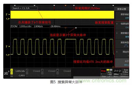 在調(diào)試異常信號時,我們通常需要明確,異常出現(xiàn)的頻率是多少,是不是周期性出現(xiàn)的呢?為了弄清楚這些問題,一般需要長時間記錄波形,然后基于這樣一個龐大的數(shù)據(jù)庫去定位和分析異常。ZDS2000系列示波器標(biāo)配的“搜索功能”,可以在海量的數(shù)據(jù)中快速定位出感興趣的信號,并自動做出標(biāo)記,用戶通過觀察標(biāo)記可快速了解異常的位置、頻率、周期等特性。