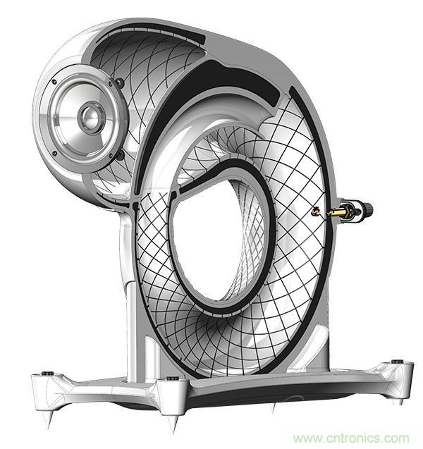 為了不必使用聲波吸收就能夠解決這個問題,畢業(yè)于以色列Bezalel藝術與設計學院的工業(yè)設計師Boaz Dekel提出了一個非常獨特的解決方案:去掉音箱的后壁。簡單地說,Dekel構思了一個圓形音箱Aleph1。在這個音箱里,向后的聲音會進入“一個永久的自送(self-feeding)回路,以防止它被直接反彈回去,干擾到向前輸出的聲音信號。”Dekel解釋說。