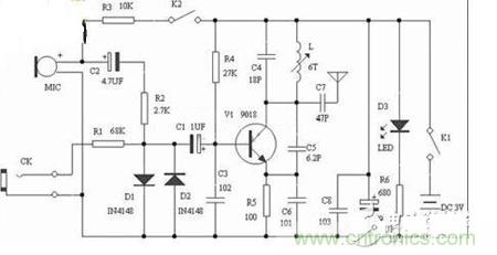 【導(dǎo)讀】FM調(diào)頻發(fā)射機(jī),發(fā)射頻率在模擬廣播波段88~108Mhz,用普通FM收音機(jī)接收,2種音信輸入,MIC頭將周邊聲音發(fā)送,CK音信輸入,調(diào)??烧{(diào)發(fā)射線(xiàn)圈L可改變(微調(diào))發(fā)射頻率。