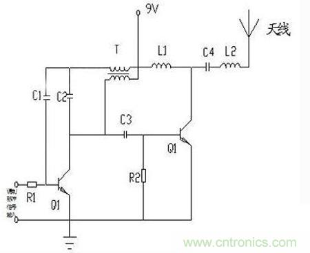 Q2是緩沖放大級(jí),Q1的輸出經(jīng)C3耦合到Q2(圖中右邊的“Q1”)基極,L1是Q2的負(fù)載電感;并經(jīng)C4/L2串聯(lián)諧振電路送到天線(xiàn)發(fā)射。R2接地,也就是零偏置,由于輸入信號(hào)幅度較大,且是以C4/L2諧振回路來(lái)選頻的,所以不怕失真,這樣效率較高。
