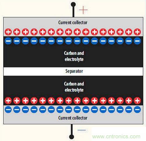 圖2是EDLC電容的橫截面圖。從圖中可以看到兩個由電解液包圍著的納米顆粒活性碳層,電解液中間則有一個“隔離”層。這兩個碳層與集電極相接觸,并由集電極將電流輸送到外部。這兩個碳層由兩個串聯電容組成,因此命名為雙層電容或DLC。由于電容內的電荷載體實際上處于離子態(tài),因此使用了術語電化學DLC(或EDLC)。這張圖也顯示了簡單的原理,其中電荷主要集中在集電極-碳接口。電容(C)直接正比于有效面積(A),并反比于這些電荷(或C a A/d)之間的隔離距離(d)。雙層電容的正負電荷之間的間距在納米范圍,這正是EDLC電容容量如此大的原因(因為這個間距要比靜電電容的電荷間距小好幾個數量級)。
