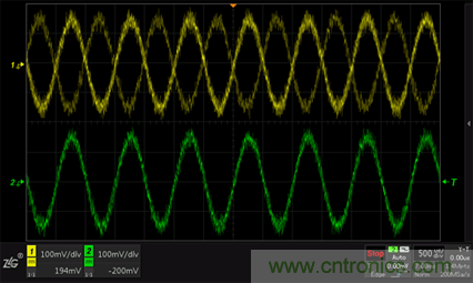 圖5 CH1不開(kāi)啟高頻抑制觸發(fā)不穩(wěn)、CH2開(kāi)啟高頻抑制