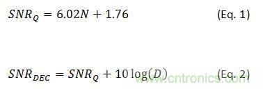 例如,要使抽取因子為2,必須讓信號(hào)的過(guò)采樣因子至少為2。在這個(gè)例子中,信號(hào)功率保持不變,但奈奎斯特帶寬被減半。這就消除了一半的噪聲功率,從而讓該ADC的SNR增加了3dB。第一個(gè)方程式表示因量化噪聲得到的理想SNR,其中N是該轉(zhuǎn)換器的位數(shù)。第二個(gè)方程式則表示與抽取因子D相關(guān)的SNR改善值。
