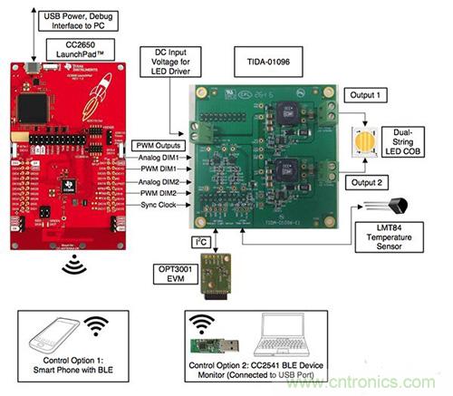 圖 5 顯示了如何使用與 SimpleLink CC2650 LaunchPad 配對(duì)的 TIDA-01096 來配置基于參考設(shè)計(jì)的 LED 照明解決方案的硬件。該項(xiàng)目的固件是由 TI 作為代碼調(diào)試器項(xiàng)目開發(fā)的,可根據(jù)要求提供。