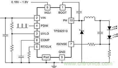 圖 2: TPS92513/HV LED 驅(qū)動(dòng)器典型應(yīng)用的簡(jiǎn)化原理圖。