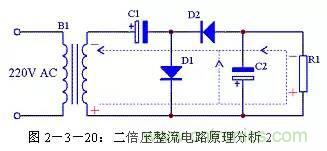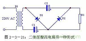 二倍壓整流電路還有另外一種形式的畫(huà)法,見(jiàn)圖2-3-21,其原理與圖2-3-18完全一致,只是表現(xiàn)形式不一樣。
