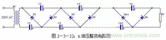 二倍壓電路還可以很容易的擴(kuò)展為n倍壓電路,具體電路見(jiàn)圖2-3-22。
