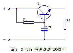 當(dāng)對(duì)濾波效果要求較高時(shí),可以通過(guò)增加濾波電容的容量來(lái)提高濾波效果。但是受電容體積限制,又不可能無(wú)限制增大濾波電容的容量,這時(shí)可以使用有源濾波電路。其電路形式見(jiàn)圖2-3-29,其中電阻R1是三極管T1的基極偏流電阻,電容C1是三極管T1的基極濾波電容,電阻R2是負(fù)載。這個(gè)電路實(shí)際上是通過(guò)三極管T1的放大作用,將C1的容量放大β倍,即相當(dāng)于接入一個(gè)(β+1)C1的電容進(jìn)行濾波。