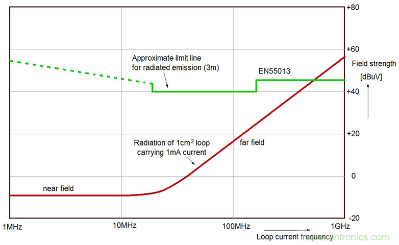 舉例而言,一個1cm²的電流環(huán),其中的電流為1mA,電流變化頻率為100MHz,則距離此電流環(huán)3m處的場強為4.4µV/m,或說是12.9dBµV。