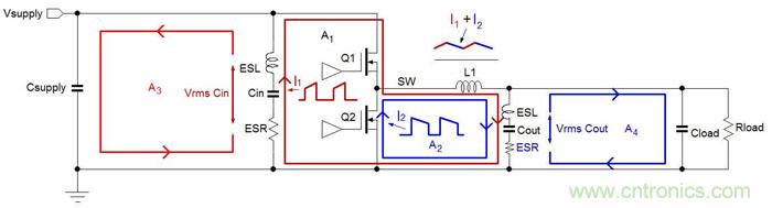 從電磁輻射的角度來看,圖3中存在陰影的A1區(qū)域是存在高電流變化率dI/dt的回路部分,這個回路將生成最多的高頻成分,因而在Buck轉(zhuǎn)換器的EMI設(shè)計中是需要被重點考慮的最關(guān)鍵部分。圖中A2區(qū)域的電流變化率dI/dt就沒有A1區(qū)域的高,因而生成的高頻噪聲也就比較少。
