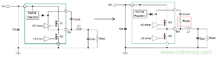 在MOSFET外置的設(shè)計中,電阻可被串接到上橋MOSFET的柵極上,這就可以同時增加上橋的導通時間和截止時間。