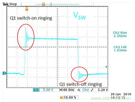 從實驗結(jié)果來看,開關(guān)切換波形上的過沖實際上已經(jīng)消失了,但還存在低頻的振鈴信號。