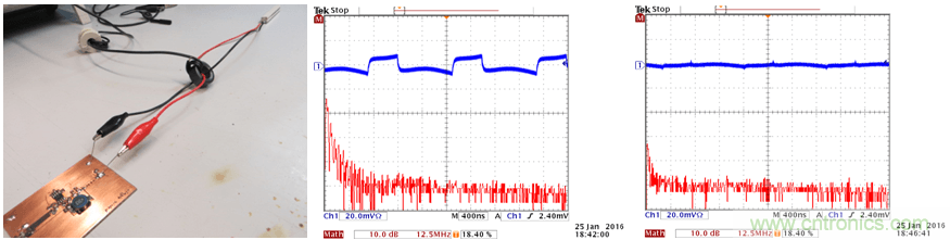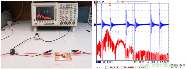 這種環(huán)形天線可以被連接到頻譜分析儀上,當你使它在PCB上方移動時,你就可以看到哪里會有比較強的高頻磁場。你也可以把它連接到一臺示波器上(使用50Ω的端子),示波器上就可以顯示出相應區(qū)域的切換噪聲水平。保持天線環(huán)和板子之間的相對位置和距離不變,對電路、PCB上的回路做出某些改變,你就可以知道噪聲水平在增加或是減少。