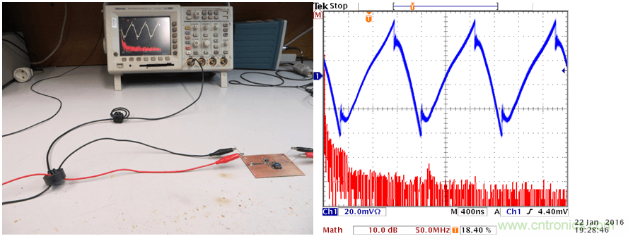電源輸入線上的高頻電流由差模電流和共模電流構(gòu)成。對于共模電流,可以在PCB布局設(shè)計時將具有高電流變化率dI/dt的電流環(huán)最小化予以消減。而差模電流則有不同的來源,我們可以如圖27那樣將正、負兩條線以不同方向穿過自制的電流探頭的磁芯來進行測量。
