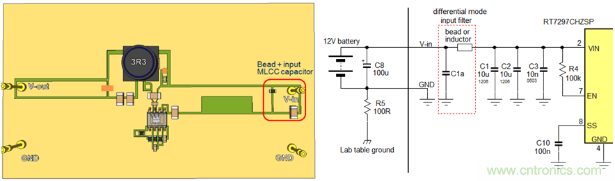 上述實驗最重要的結(jié)論是確認了更好地放置CIN可以改善開關(guān)切換波形上的過沖和振鈴信號的幅度,還能降低高頻輻射。