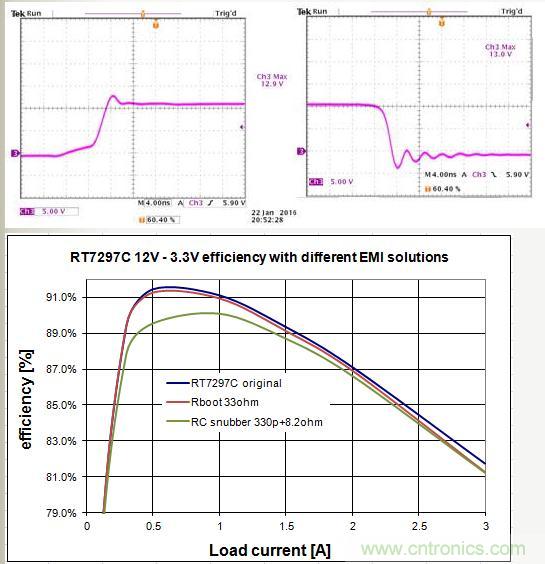 RC平滑抑制電路對效率的影響會比較大,特別是在輕載和中等負載的情況下,但最大也就1~2%,處于可以接受的范圍。需要特別注意的是,當Buck轉(zhuǎn)換器的工作頻率很高和輸入電壓很高的時候,RC平滑抑制電路對效率的影響會很大。