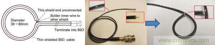 其實我們是有可能在實驗室環(huán)境下對產(chǎn)品原型進行一些基本的EMI測試的,還可對系統(tǒng)的各個模塊分別進行。這樣的測試通常屬于近場環(huán)境(測量距離 < 0.16λ),因而在測試電流回路的輻射狀況時需要使用小型的環(huán)形天線來對高頻磁場進行測量。你可以使用一段50Ω的同軸電纜自己制作小型的擁有電屏蔽的環(huán)形天線,這看起來并不是一件很難的事情,可參考圖43的示意進行。