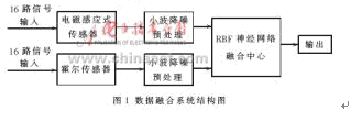 多傳感器數(shù)據(jù)融合在運用過程的各階段(例如模型建立、特征提取、目標識別等)需要各種各樣的傳感器。由于沒有哪一類傳感器的各種性能指標都絕對比其他類型傳感器好,因此在一個系統(tǒng)中,需要同時采用多種類型的傳感器,以提高系統(tǒng)檢測、識別、分類和決策能力。本文根據(jù)系統(tǒng)的需要使用了兩類傳感器:電磁感應式傳感器和霍爾傳感器,利用它們之間產(chǎn)生的冗余信息進而檢測出缺陷信號。數(shù)據(jù)融合系統(tǒng)結構如圖1所示。