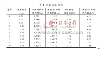 本文采用MATLAB軟件進行仿真實驗,通過提供的40組人工裂縫的樣本,對RBF神經(jīng)網(wǎng)絡系統(tǒng)進行訓練學習和模式識別,并在學習初期對輸入數(shù)據(jù)進行了預處理,通過樣本訓練逐漸生成最佳的RBF期網(wǎng)絡[8]。另取10組測試樣本數(shù)據(jù)作為輸入,用MATLAB軟件進行模擬仿真,同時利用RBF神經(jīng)網(wǎng)絡對其進行深度評估,并與常規(guī)BP神經(jīng)網(wǎng)絡進行對比,其實驗仿真結果如表1所示。