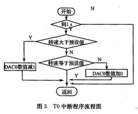 本系統(tǒng)采用C8051F060中的INT0中斷對轉(zhuǎn)速脈沖計數(shù)。定時器T1工作于外部事件計數(shù)方式對轉(zhuǎn)速脈沖計數(shù);T0工作于定時器方式均工作于方式1。每到1 s讀一次計數(shù)值,此值即為脈沖信號的頻率,根據(jù)式(1)可計算出電機的轉(zhuǎn)速。由于直流電機的轉(zhuǎn)速與施加工于電機兩端的電壓大小有關,故將實際測得的轉(zhuǎn)速值與預設的轉(zhuǎn)速值比較,若大于預設的轉(zhuǎn)速值則減小DAC0的數(shù)值,若小于轉(zhuǎn)速預設的轉(zhuǎn)速值則增加DAC0的值調(diào)整電機的轉(zhuǎn)速,直到轉(zhuǎn)速值等于預設定的值,這樣就實現(xiàn)了對電機轉(zhuǎn)速的控制,主程序和T0中斷流程圖如圖2、3所示。