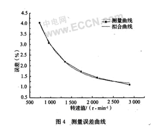 首先在軟件中給出轉(zhuǎn)速預設值,即給定常量speed的值,觀察速度穩(wěn)定后七段數(shù)碼管的數(shù)值,比較實際測量的轉(zhuǎn)速值和預設轉(zhuǎn)速值,計算測量誤差,評價測量的準確性,測試結(jié)果如表1所示。根據(jù)實驗測試和誤差分析繪制了測量誤差曲線,如圖4所示。誤差分析表明,轉(zhuǎn)速測量誤差在5%以內(nèi),并且隨著轉(zhuǎn)速預設值的增加測量誤差愈小,呈指數(shù)形式下降,函數(shù)關系如式(3)所示。