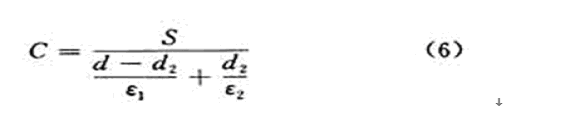 顯然,在電容器極板的遮蓋面積S,兩極板之間的距離d,被測物體上下側(cè)至電極之間介質(zhì)的介電常數(shù)ε1和ε3確定時(shí),電容量的大小就和被測材料的厚度d2及介電常數(shù)ε2有關(guān)。如被測材料介電常數(shù)ε2已知,就可以測量等厚教材料的厚度d2;或者被測材料的厚度d2已知,就可測量其介電常數(shù)ε2。這就是電容式測厚儀和電容式介電常數(shù)測量儀的工作原理。