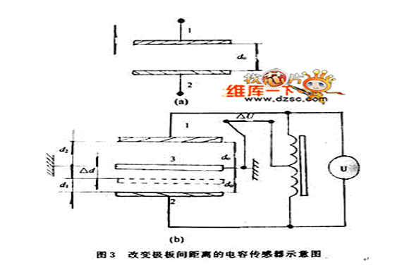 圖3是這類傳感器的原理圖,圖3(a)由2塊極板構(gòu)成,其中極板2為固定極板,極板1為與被測物體相連的活動(dòng)極板,可上下移動(dòng)。當(dāng)極板間的遮蓋面積為S,極板間介質(zhì)的介電常數(shù)為ε,初始極板間距為d0時(shí),則初始電容C0為: