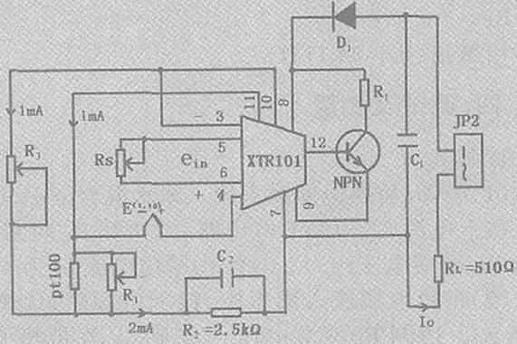 整套系統(tǒng)要求在0~100℃范圍對應(yīng)輸出4mA~20mA的電流型溫度變送器。