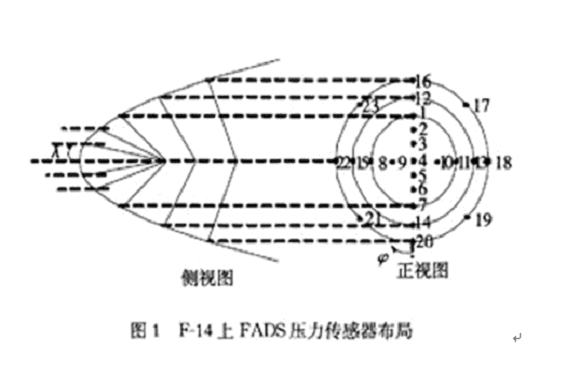 FADS一般安裝在飛行器前端,為了不影響雷達(dá)和火控裝置的安裝,也有將FADS安裝在機(jī)翼前端。F-14的FADS由23個壓力傳感器組成,安裝在機(jī)身前端。X-33的FADS系統(tǒng)則由6個壓力傳感器組成,安裝在機(jī)身前端。壓力傳感器的數(shù)目并沒有固定的規(guī)定。在F-14飛機(jī)上,其FADS的壓力傳感器布局如圖1所示。