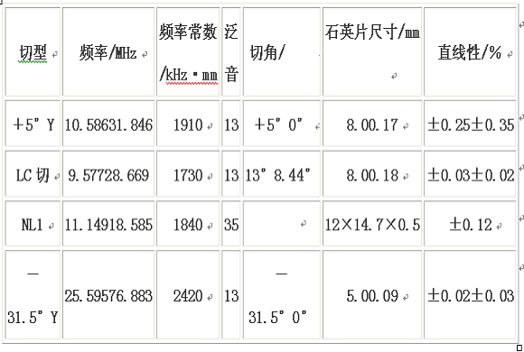石英晶體的頻率溫度特性方程為:f=fO(1+aΔT+bΔT2+cΔT3),由此可見,通過切角的選擇,使系數(shù)b和c接近于零,可提高頻率溫度的線性度。石英晶體溫度計(jì)就是利用石英晶體的頻率溫度特性原理制成的。最先采用的為+5°Y切型,后來美國發(fā)明了溫度特性極好的LC切型,日本發(fā)明了NL切型,東洋通信研制的-31.5°Y切型的詳情見表1。
