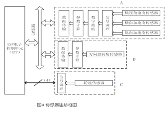 本文所作設(shè)計的框圖如圖4所示。在圖中,方向盤轉(zhuǎn)角傳感器信號經(jīng)微控制器處理后,通過CAN總線發(fā)送給ECU(圖4中B);橫擺角速度傳感器、縱向/橫向傳感器由于信號特點和安裝位置類似,故設(shè)計在同一個模塊內(nèi)(圖4中A);由于ESP對輪速傳感器信號的實時性要求較高,故經(jīng)過信號調(diào)理后,直接送入ECU(圖4中C)。在圖4的A和B中,需要微處理器對信