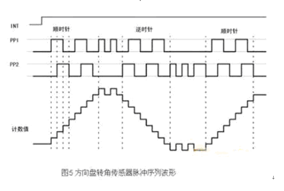 方向盤轉(zhuǎn)角傳感器的輸出為正交編碼脈沖。正交編碼脈沖包含兩個脈沖序列,有變化的頻率和四分之一周期(90°)的固定相位偏移,如圖5所示。通過檢測2路信號的相位關(guān)系可以判斷為順時針方向和逆時針方向,并據(jù)此對信號進行加/減計數(shù),從而得到當前的計數(shù)累計值,也即方向盤的絕對轉(zhuǎn)角,而轉(zhuǎn)角的變化率即角速度,則可通過信號頻率測出。另外,方向盤轉(zhuǎn)角傳感器有一個零位輸出信號,當方向盤在中間位置時,該信號輸出0V,否則輸出5V,通過該信號,可對絕對轉(zhuǎn)角進行在線校準。