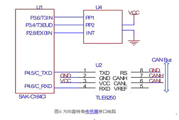C164CI與方向盤轉(zhuǎn)角傳感器的接口電路如圖6所示。片內(nèi)內(nèi)置增量編碼的正交解碼器,該解碼器使用定時器3的兩個引腳(T3IN、T3EUD)作為正交脈沖的輸入,在正確設(shè)置相關(guān)寄存器后,定時器3的數(shù)據(jù)寄存器的值與方向盤轉(zhuǎn)角成正比,故可方便的計算轉(zhuǎn)角,本文所使用的方向盤轉(zhuǎn)角傳感器每一圈對應(yīng)44個脈沖,設(shè)定時器3的數(shù)據(jù)寄存器為T3,則絕對轉(zhuǎn)角為。