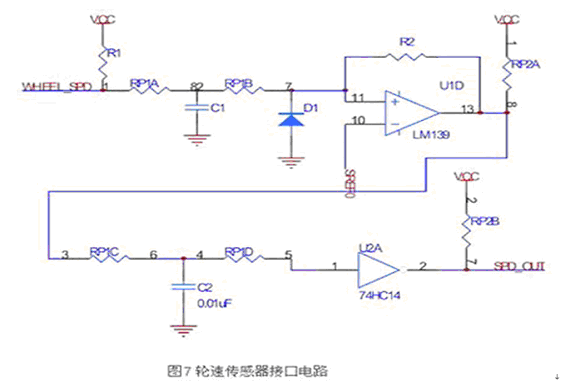 根據(jù)前面部分介紹的輪速傳感器信號特點,設(shè)計接口電路如圖7所示。