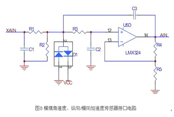 橫擺角速度、縱向/橫向加速度傳感器的安裝位置基本相同,輸出都是0V-5V的模擬量,由于汽車顛簸造成的信號波動特性一致,故封裝在同一模塊中。其硬件接口如圖8所示,實現(xiàn)硬件模擬前置濾波,以抑制來自傳感器的模擬信號中的高頻噪聲成分,防止在采樣過程中出現(xiàn)混疊現(xiàn)象。運放使用滿擺幅輸出的LMX324。