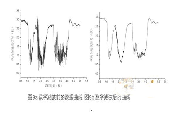 調(diào)整圖8中各個阻容元件的參數(shù),即可設(shè)置濾波截止頻率和延時大小。汽車運行過程中,在較好路面上行駛時,由于信號較好,延時盡量要小,而在顛簸路面上行駛,則希望濾波效果要好。但是由于硬件濾波的頻率特性一經(jīng)設(shè)計完畢,無法實時修改,故需要在軟件中設(shè)計數(shù)字濾波環(huán)節(jié)。數(shù)字濾波常用的有維納濾波器、卡爾曼濾波器、線性預(yù)測器、自適用濾波器等。在這里選用計算量小、實時性能好的一階低通濾波。