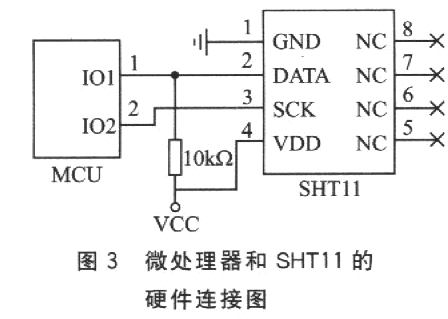 SHTl1通過二線數(shù)字串行接口來訪問,所以硬件接口電路非常簡(jiǎn)單。需要注意的地方是:DATA數(shù)據(jù)線需要外接上拉電阻,時(shí)鐘線SCK用于微處理器和SHTll之間通信同步,由于接口包含了完全靜態(tài)邏輯,所以對(duì)SCK最低頻率沒有要求;當(dāng)工作電壓高于4.5V時(shí),SCK頻率最高為10 MHz,而當(dāng)工作電壓低于4.5 V時(shí),SCK最高頻率則為1 MHz。硬件連接如圖3所示。