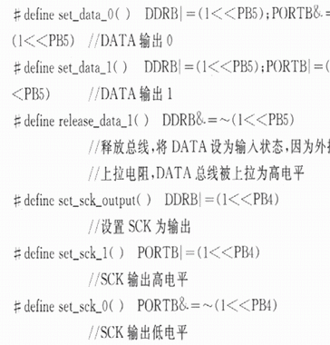 通過以上宏定義,可以實(shí)現(xiàn)SCK和DATA總線的各種輸入和輸出狀態(tài)。為了模擬該二線串行數(shù)字協(xié)議,還需要一個(gè)延時(shí)函數(shù)。WINAVR庫(kù)函數(shù)提供了一個(gè)延時(shí)函數(shù)_delay_loop_2(unslgned char s),該延時(shí)函數(shù)運(yùn)行用4個(gè)時(shí)鐘周期,所以白定義延時(shí)1μs函數(shù)可以定義如下:#deftne CPU_CRYSTAL 7.3728