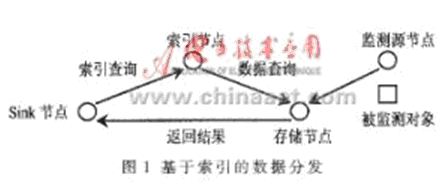 (4)基于索引的數(shù)據(jù)分發(fā)方案(index-based data dissemination scheme)[3],這種方案克服了以上幾種方案存在的問題。在這種方案中,負責監(jiān)測某對象的源節(jié)點定期產(chǎn)生該監(jiān)測對象的感知數(shù)據(jù),并存儲到存儲節(jié)點上,存儲節(jié)點可能是該源節(jié)點,也可能是鄰近的某個節(jié)點。同時,存儲節(jié)點的位置信息(稱為索引),要增加到索引節(jié)點上。當sink節(jié)點想查詢某個被監(jiān)測對象產(chǎn)生的感知數(shù)據(jù)時,就發(fā)送一條查詢消息給有關的索引節(jié)點,索引節(jié)點收到該消息后轉(zhuǎn)發(fā)查詢請求給相應的存儲節(jié)點,由存儲節(jié)點直接發(fā)送查詢結(jié)果給sink節(jié)點。其基本思想如圖1所示。這種數(shù)據(jù)分發(fā)方案避免了發(fā)送不需要的感知數(shù)據(jù),也不需要把控制信息泛洪到整個網(wǎng)絡,改善了整個系統(tǒng)的性能,但是增加了維護索引節(jié)點的額外費用。