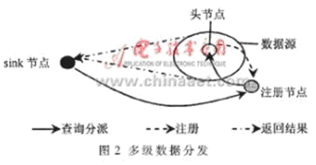 (5)多級數(shù)據(jù)分發(fā)方案(multi-resolution data dissemination scheme)[4],綜合了LS和DCS數(shù)據(jù)分發(fā)方案的技術。其基本思想是在數(shù)據(jù)源中選擇一個頭節(jié)點,代表源節(jié)點在最近的注冊節(jié)點上進行注冊。sink節(jié)點把查詢發(fā)送到所有注冊節(jié)點上,從注冊節(jié)點再把查詢發(fā)送到所有匹配的頭節(jié)點,當頭節(jié)點收到查詢后,在數(shù)據(jù)源內(nèi)選擇一組節(jié)點進行查詢。由于sink節(jié)點的位置包含在它分派的查詢中,查詢節(jié)點可以直接把感知數(shù)據(jù)發(fā)送給sink節(jié)點,其基本思想如圖2所示。這種數(shù)據(jù)分發(fā)方案避免了查詢泛洪,能有效減少能量消耗。但是在數(shù)據(jù)源中只是基于感知范圍參數(shù)來選擇查詢節(jié)點,沒有考慮數(shù)據(jù)的分布情況。