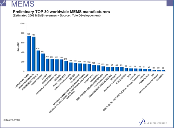 - 市場(chǎng)研究公司Yole Developpement近日發(fā)布2008年MEMS廠商排名