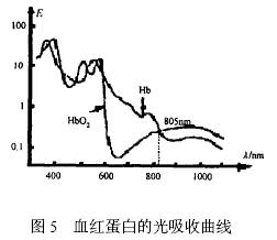 脈搏信號主要由動脈血的充盈引起, 而血液中還原血紅蛋白( Hb) 和氧合血紅蛋白( HbO2 ) 含量變化將造成透光率的變化, 當氧合血紅蛋白和還原血紅蛋白對光的吸收量相等時, 透射光的強度將主要由動脈血管的收縮和舒張引起, 此時能夠比較準確地反映出脈搏信號。圖5 為血紅蛋白的光吸收曲線, 從圖中可以看出, 血液中HbO2 和Hb 對于不同波長光的吸收系數(shù)的差異明顯, 而且2 條曲線好幾個不同的交點, 考慮到在805 nm 波長處, 血紅蛋白的光吸收率比較低, 那么透射過手指的光強較大, 有利于光敏器件的接收, 因此發(fā)射光源的波長選擇為805 nm。