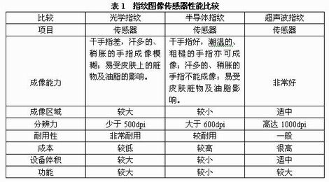 3種指紋圖像傳感器各有優(yōu)缺點,如表1所示。
