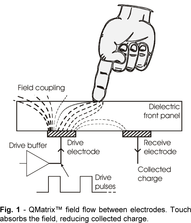 圖1 :兩個(gè)電極之間的 QMatrix 場(chǎng)流。觸摸可吸收該電場(chǎng),導(dǎo)致所收集的電荷減少。