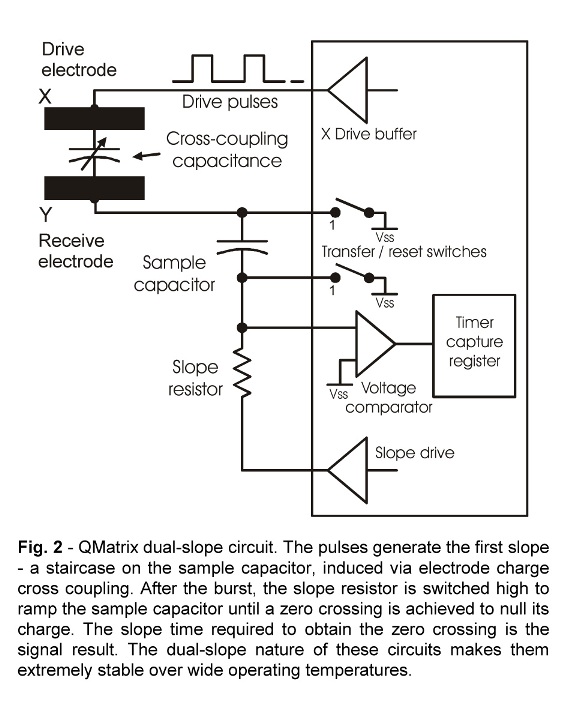 QMatrix器件采用一個(gè)掃描式的橫向電極無(wú)源矩陣,實(shí)現(xiàn)了使用單芯片驅(qū)動(dòng)的大量觸摸按鍵。這種構(gòu)造可提高感測(cè)芯片的引腳利用效率,較之于每個(gè)按鍵都需要一個(gè)感測(cè)連接 (如 Qtouch™ 及許多同類器件),芯片和按鍵矩陣之間所需的連接數(shù)量較少。QMatrix 器件所需的部件最少,最大限度地降低了單個(gè)按鍵的成本。在量產(chǎn)時(shí),此器件可以令芯片成本降至每按鍵 0.05 美元。此外,這種構(gòu)造本身就具有抵抗環(huán)境變化、水膜影響以及無(wú)線電干擾的特性。